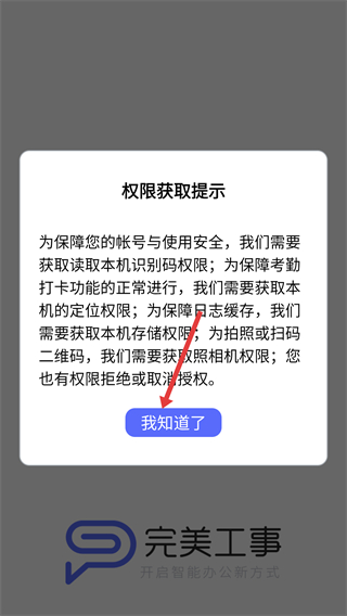 1、遇到【權限獲取提示】,需了解要獲取的【本機識別碼-定位-照相機】權限,確認后點擊【我知道了】繼續(xù)使用【完美工事】。