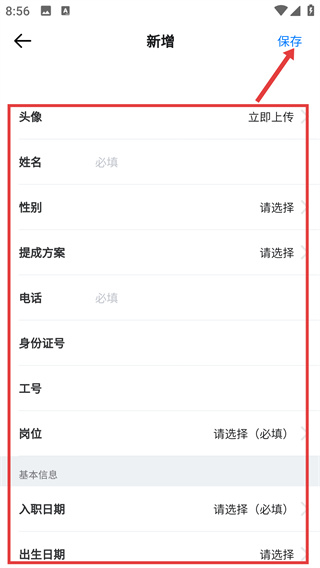 4、在【新增】人員頁面,填寫【姓名】、【電話】等必填信息,完成后點擊【保存】按鈕,即可完成新人員信息的添加。