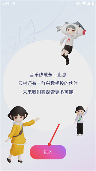 1、在云村歡迎頁面,點擊【進入】按鈕,即可進入應用,與興趣相投的音樂伙伴互動并探索更多可能。
