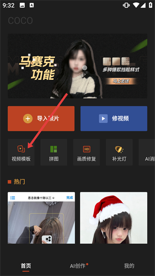 1、在應(yīng)用首頁(yè)點(diǎn)擊【視頻模板】選項(xiàng),可進(jìn)入模板選擇界面,搭配【馬賽克功能】等工具開(kāi)啟內(nèi)容制作。