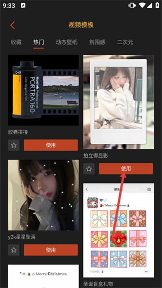 2、在【視頻模板】頁(yè)面選擇【拍立得顯影】模板,點(diǎn)擊對(duì)應(yīng)的【使用】按鈕,即可應(yīng)用該模板進(jìn)行創(chuàng)作。