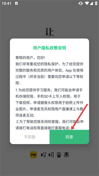 1、彈出【用戶隱私政策說明】彈窗后,點擊【同意】按鈕,授權(quán)應用所需的存儲、攝像頭等權(quán)限,繼續(xù)進入應用主界面。