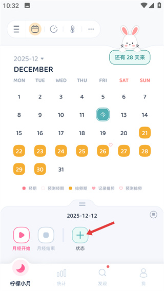 1、在日歷頁面,點擊底部的【狀態(tài)】按鈕,進入記錄狀態(tài)界面,用于記錄經(jīng)期相關(guān)的各類信息。