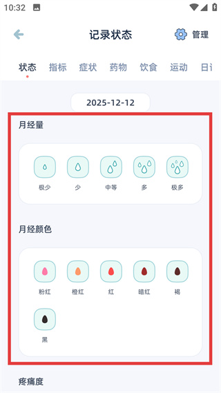 2、進入記錄狀態(tài)頁面,可選擇【月經(jīng)量】、【月經(jīng)顏色】等選項,記錄當(dāng)前的經(jīng)期狀況。