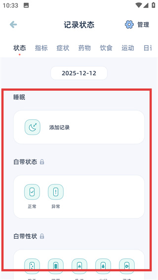 3、在記錄狀態(tài)頁面,還能點擊【睡眠】的添加記錄,選擇【白帶狀態(tài)】的正常/異常選項,完善經(jīng)期相關(guān)數(shù)據(jù)。