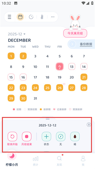 4、完成狀態(tài)記錄后,日歷頁面會更新經(jīng)期標(biāo)識,可通過底部的【取消開始】、【月經(jīng)結(jié)束】按鈕管理經(jīng)期狀態(tài)。