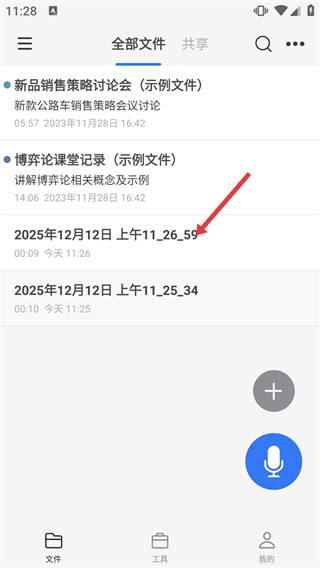 1、在【全部文件】列表中,選擇目標音頻文件,點擊進入該文件的詳情播放頁面。