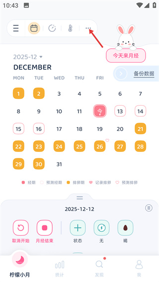 1、進(jìn)入APP的日歷界面,可查看【2025-12】的日期排布,點(diǎn)擊頂部【...】按鈕能調(diào)出功能選項(xiàng)。
