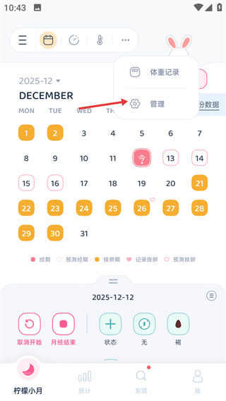 2、在日歷界面點(diǎn)擊右上角...按鈕,會(huì)彈出含【體重記錄】的菜單,選擇其中的【管理】選項(xiàng),即可進(jìn)入對應(yīng)功能設(shè)置頁面。
