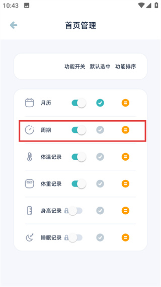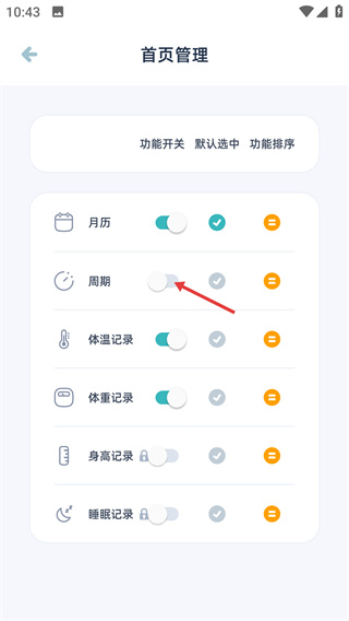 4、在【首頁管理】的【功能開關(guān)】中,點(diǎn)擊【周期】對應(yīng)的開關(guān)按鈕,可將該功能從開啟狀態(tài)切換為關(guān)閉狀態(tài),即可完成周期關(guān)閉顯示操作。