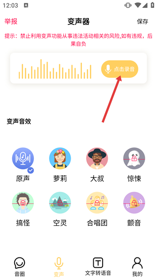 2、進(jìn)入【變聲器】頁面后,點(diǎn)擊【點(diǎn)擊錄音】按鈕,開始錄制需要變聲的音頻內(nèi)容。