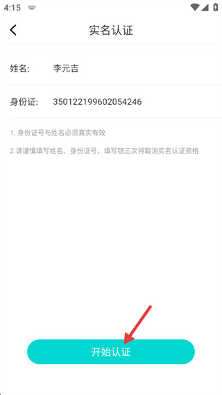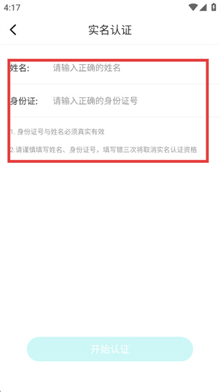 4、填寫完成【姓名】與【身份證】信息后,點擊頁面底部的【開始認(rèn)證】按鈕,提交實名認(rèn)證申請。
