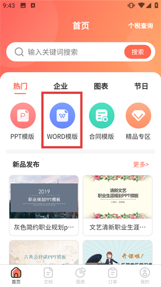 1、在首頁找到【W(wǎng)ORD模板】選項(xiàng)并點(diǎn)擊,進(jìn)入對應(yīng)的模板分類頁面,可查看各類辦公場景下的文檔模板資源。