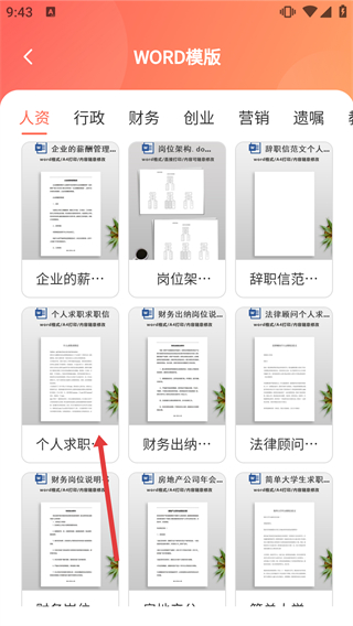 2、進(jìn)入【W(wǎng)ORD模板】頁面后,在人資分類中選擇【個(gè)人求職職信】模板,進(jìn)入該模板的詳情展示界面。