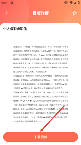 3、進(jìn)入【個(gè)人求職職信】模板詳情頁,查看模板內(nèi)容后,點(diǎn)擊底部【下載模板】按鈕,觸發(fā)模板的獲取流程。