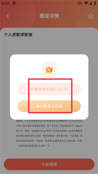 4、觸發(fā)下載后會(huì)彈出選項(xiàng)窗口,可通過【開通會(huì)員低至0.1元/天】或【單次購買4.88】的方式獲取模板下載權(quán)限。