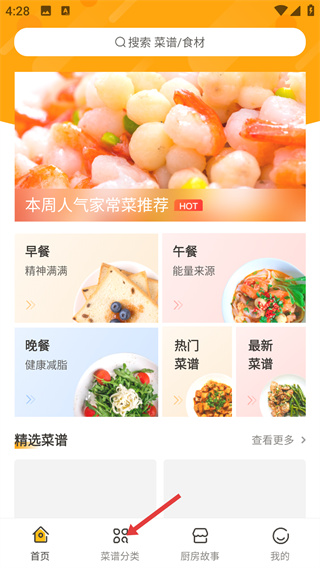 1、在APP首頁(yè),點(diǎn)擊底部的【菜譜分類(lèi)】按鈕,可進(jìn)入菜譜的分類(lèi)選擇頁(yè)面,便于精準(zhǔn)查找對(duì)應(yīng)類(lèi)型的菜譜。