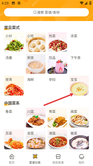 2、進(jìn)入菜譜分類(lèi)頁(yè)面后,找到【寶寶】分類(lèi)選項(xiàng)并點(diǎn)擊,即可進(jìn)入適配寶寶飲食的菜譜列表頁(yè)面。