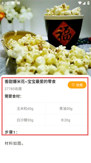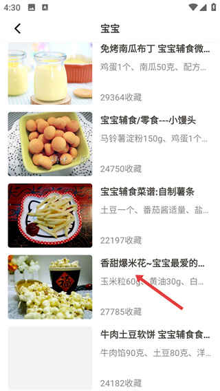 3、在寶寶菜譜列表中,選擇【香甜爆米花~寶寶最?lèi)?ài)的零食】這類(lèi)菜譜并點(diǎn)擊,可進(jìn)入該菜譜的詳細(xì)內(nèi)容頁(yè)。
