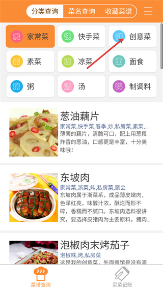 1、在分類查詢頁面,點(diǎn)擊【創(chuàng)意菜】標(biāo)簽,可篩選出對(duì)應(yīng)類別的菜譜,精準(zhǔn)定位創(chuàng)意烹飪方案。