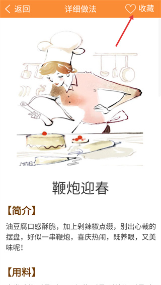 3、點(diǎn)擊菜品進(jìn)入【詳細(xì)做法】頁,可查看【鞭炮迎春】的簡介與用料,點(diǎn)擊右上角【收藏】按鈕留存該菜譜。