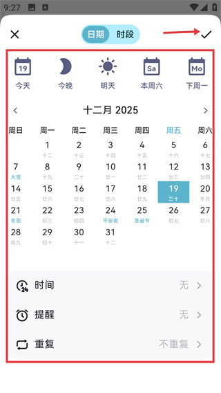 3、打開日期選擇界面,利用【今天】、【今晚】等快捷選項(xiàng),或【十二月-2025】日歷設(shè)時(shí)間、提醒、重復(fù),選好后點(diǎn)【√】確認(rèn)。