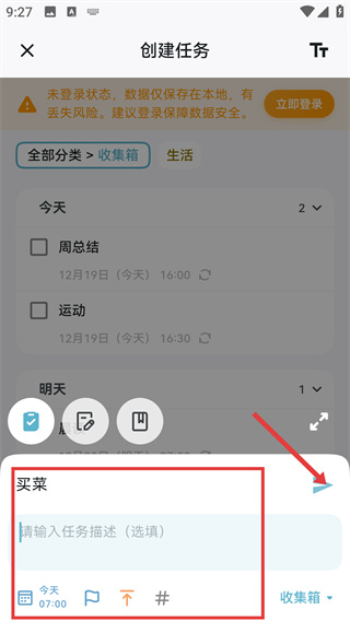 4、在創(chuàng)建任務(wù)界面填好【買菜】等任務(wù)內(nèi)容,確認(rèn)日期等設(shè)置后,點(diǎn)擊右側(cè)箭頭按鈕,即可完成任務(wù)創(chuàng)建并加入列表。