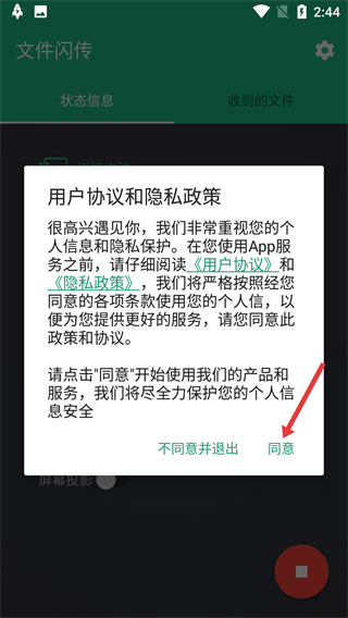 1、在文件閃傳的【用戶協(xié)議和隱私政策】彈窗中,閱讀條款后點擊【同意】按鈕,進(jìn)入應(yīng)用的功能操作界面。