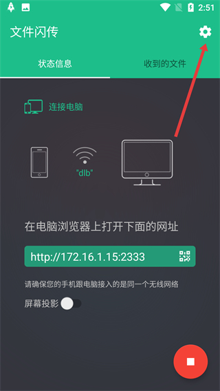 2、進(jìn)入文件閃傳主界面后,點擊右上角的【設(shè)置】圖標(biāo),進(jìn)入應(yīng)用的設(shè)置配置頁面。