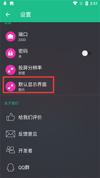 3、在設(shè)置頁面中,找到【默認(rèn)顯示界面】選項(當(dāng)前默認(rèn)選擇為“照片”),點擊該選項可調(diào)整應(yīng)用啟動后的默認(rèn)展示內(nèi)容。