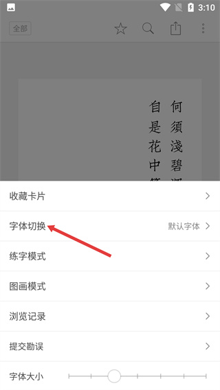 2、打開【三點圖標(biāo)】對應(yīng)的菜單后,能看到【字體切換】、【練字模式】等功能選項,點擊【字體切換】可進入字體設(shè)置界面。