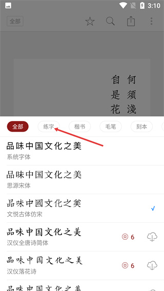 3、進入【字體切換】界面后,選擇【練字】分類,可查看對應(yīng)的字體列表,包含系統(tǒng)字體及不同風(fēng)格的字體選項。