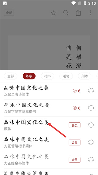 4、在【練字】字體列表中,部分字體標(biāo)注【會員】標(biāo)識,需開通會員才能使用,可選擇對應(yīng)字體應(yīng)用到詩詞展示中。