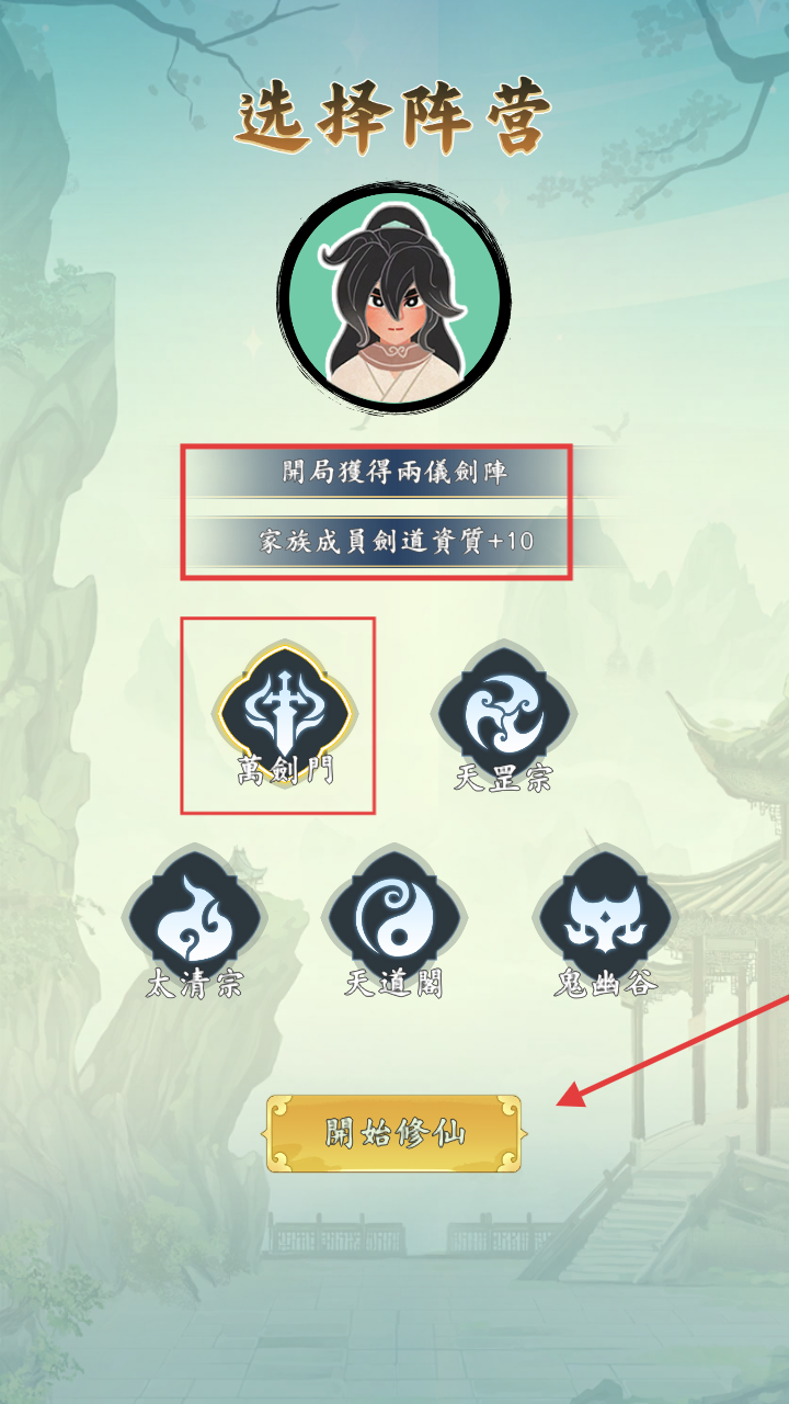 1、選擇【萬劍門】陣營可開局獲得【兩儀劍陣】,家族成員劍道資質(zhì)+10,之后點(diǎn)擊【開始修仙】進(jìn)入游戲。