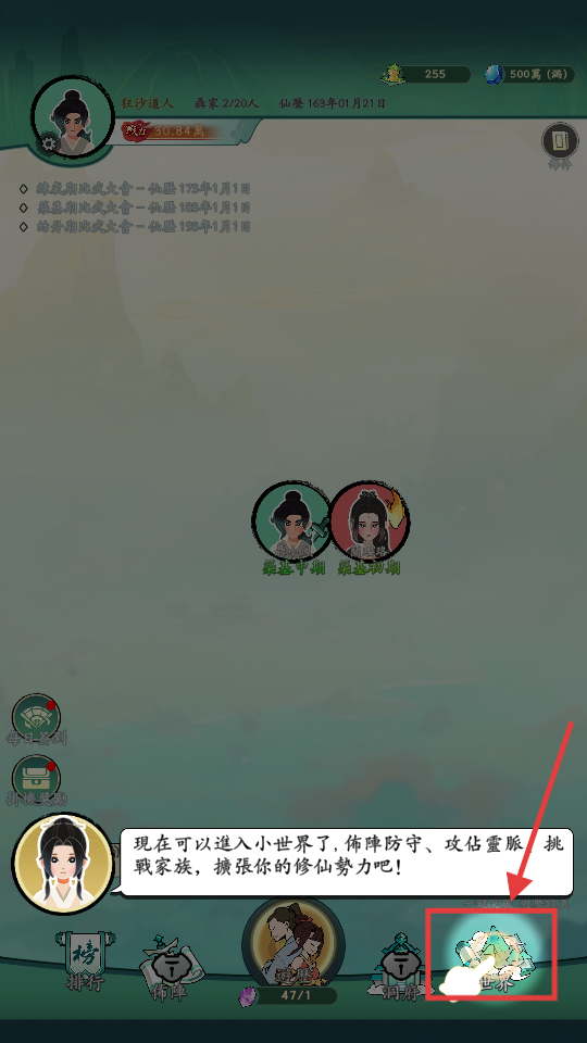 3、現(xiàn)在可進(jìn)入小世界,通過布陣防守或攻佔(zhàn)靈脈增強(qiáng)修仙勢力,點(diǎn)擊界面底部的【世界】按鈕即可。