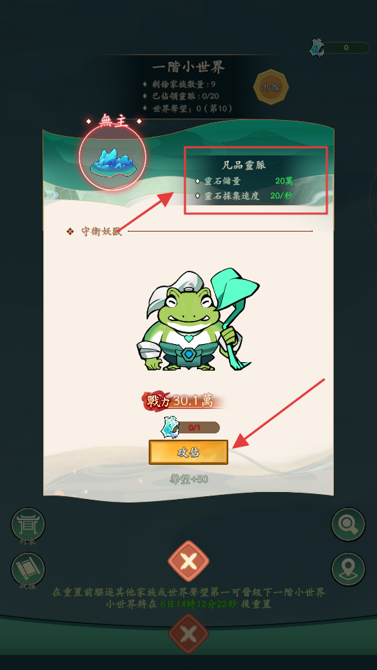 4、在【一階小世界】中,面對戰(zhàn)力【30.1萬】的守衛(wèi)妖獸,點(diǎn)擊【攻佔(zhàn)】按鈕獲取靈脈資源。