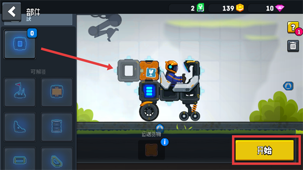 1、將【部件】中的車架組裝在貨物后方,運(yùn)輸時(shí)能有效保護(hù)貨物,組裝好就點(diǎn)擊【開(kāi)始】進(jìn)入運(yùn)輸挑戰(zhàn)吧。