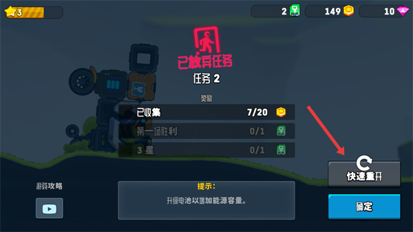 4、若任務(wù)失敗,點(diǎn)擊【快速重開(kāi)】,能快速重新挑戰(zhàn)任務(wù)2,爭(zhēng)取完成【金幣收集】等目標(biāo)哦。