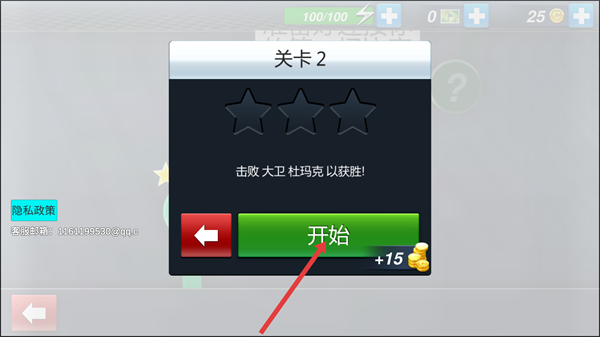 2、在關(guān)卡2界面,點擊綠色【開始】按鈕,即可進入比賽,同時可獲得+15金幣獎勵。