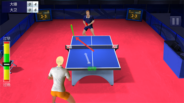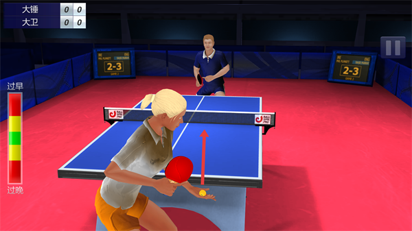 3、比賽中,觀察左側(cè)【過早】【過晚】的提示條,把握時機在合適的時機發(fā)球并擊球,與對手大衛(wèi)進行乒乓球?qū)Q。