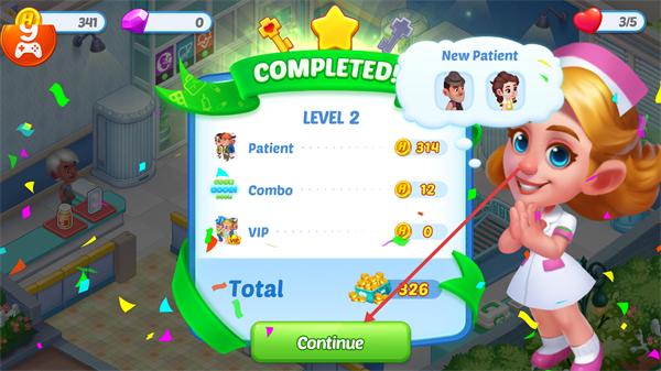 4、游戲完成后,獲得【314】患者金幣與【12】連擊獎(jiǎng)勵(lì),點(diǎn)擊【Continue】按鈕進(jìn)入后續(xù)關(guān)卡。