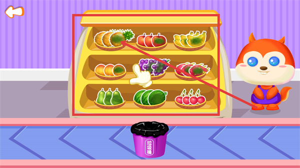 2、聚焦被框選的【水果貨架】,發(fā)現(xiàn)發(fā)霉的水果,點(diǎn)擊貨架帶有綠色的水果物品,借助下方的【垃圾桶】,處理錯位物品以規(guī)整貨架的物品擺放。