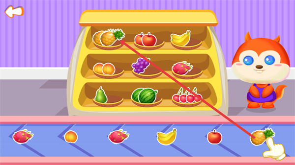 3、觀察貨架下方傳送帶出現(xiàn)的水果,將貨架上對應(yīng)的水果物品,匹配到傳送帶的對應(yīng)位置,完成該類水果的分類歸位。