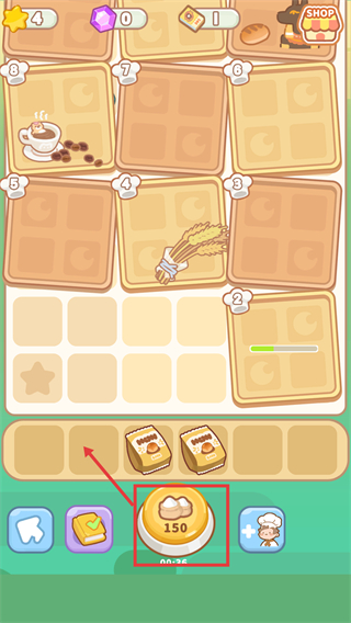 2、進(jìn)入放置界面后,點(diǎn)擊標(biāo)有【150】的核心按鈕,解鎖下方面包類道具,為網(wǎng)格放置操作做準(zhǔn)備。