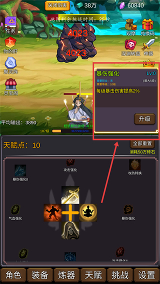 1、優(yōu)先升級【暴傷強化】天賦,每級提升暴擊傷害2%,積累天賦點強化戰(zhàn)斗屬性,助力前期快速提升輸出能力。