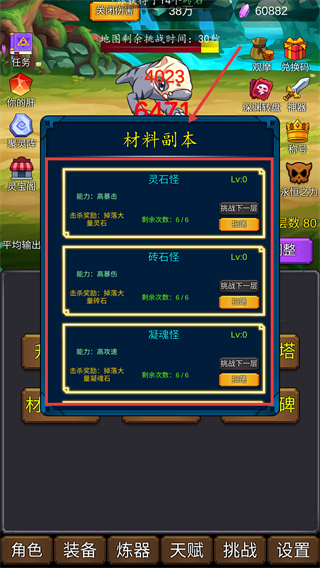 3、每日掃蕩【材料副本】中的【靈石怪】-【磚石怪】-【凝魂怪】,利用剩余次數(shù)獲取大量資源,加速角色成長。