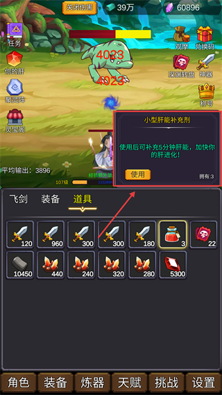 4、合理使用【小型肝能補充劑】,補充5分鐘肝能加快進化,提升掛機效率,助力持續(xù)積累修為和資源。