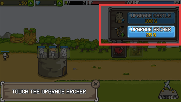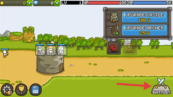 4、戰(zhàn)斗結(jié)束后,按點(diǎn)擊【UPGRADE-ARCHER】,強(qiáng)化弓箭手,增強(qiáng)下一波戰(zhàn)斗的輸出能力。