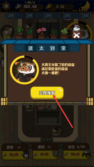 1、觸發(fā)大胃王光臨食堂的事件后,點(diǎn)擊【立即領(lǐng)取】拿獎(jiǎng)勵(lì),關(guān)注【速度】【情緒】等屬性提升餐廳接待效率。