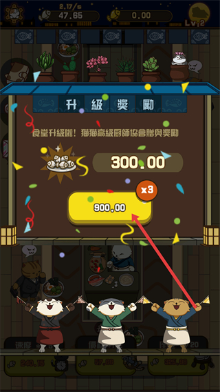 4、領(lǐng)取【升級獎(jiǎng)勵(lì)】,獲得的小魚干900的資源和道具可用于升級餐臺與菜品。